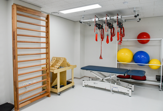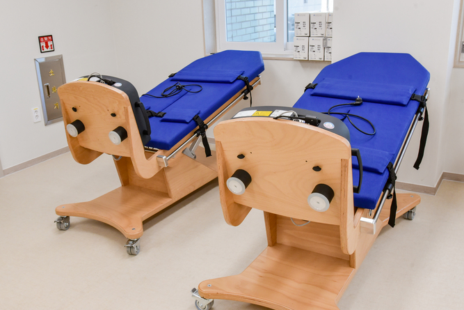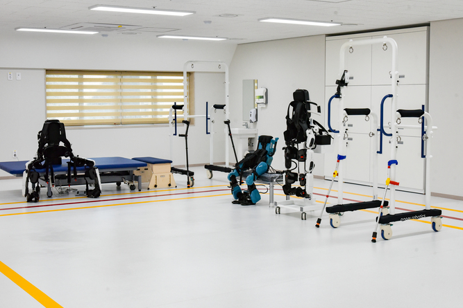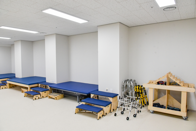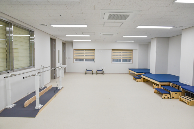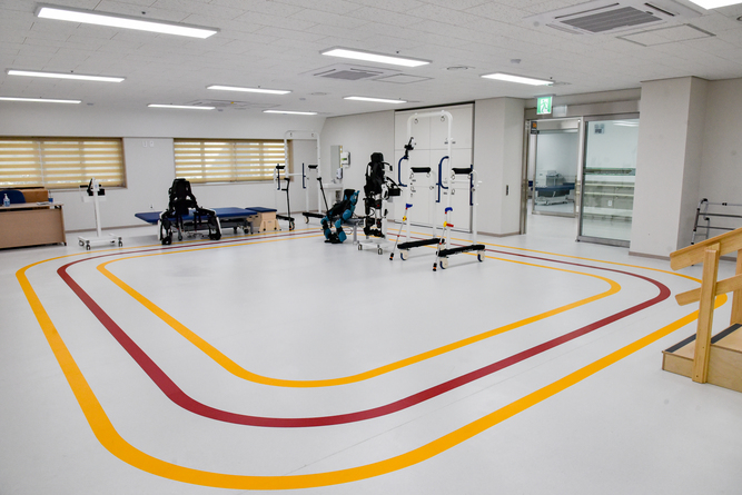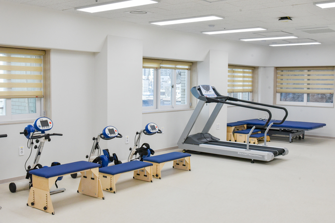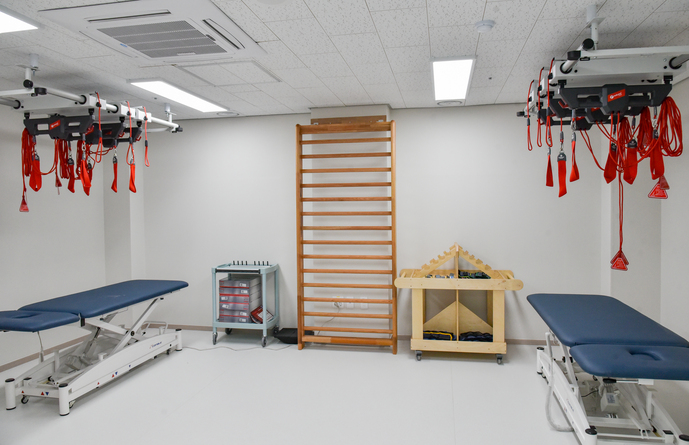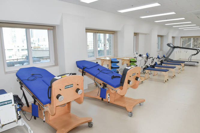 갈릴레오·경사 침대·기립기·상하지 에르고미터·트레드밀 등을 통해 자세 안정성 증진, 체중 부하 훈련, 올바른 자세 정렬 및 보행 패턴 학습을 지원합니다.
